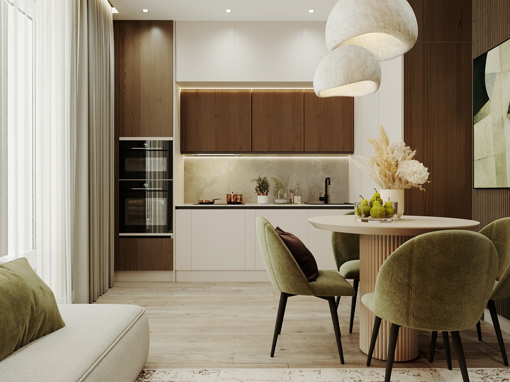 В интерьеры были использованы природные оттенки и фактуры — дерево, камень, стекло, оттенки зелени и песка.