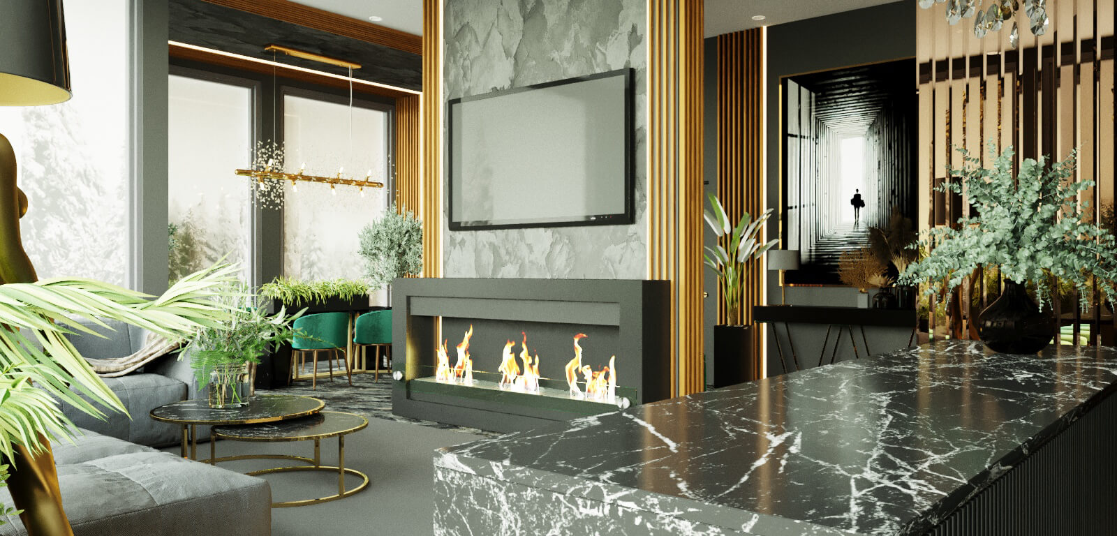 Интерьер дома в Туле спроектирован как современное, элегантное пространство с выразительным характером. Архитектура интерьера подчеркнута натуральными фактурами камня, вертикальными декоративными панелями и встроенной подсветкой. Кухонная зона с островом и барными стульями органично вписана в общее пространство, формируя удобный сценарий для повседневной жизни и приема гостей. Акцентные светильники и латунные детали добавляют интерьеру глубину и ощущение сдержанной роскоши.