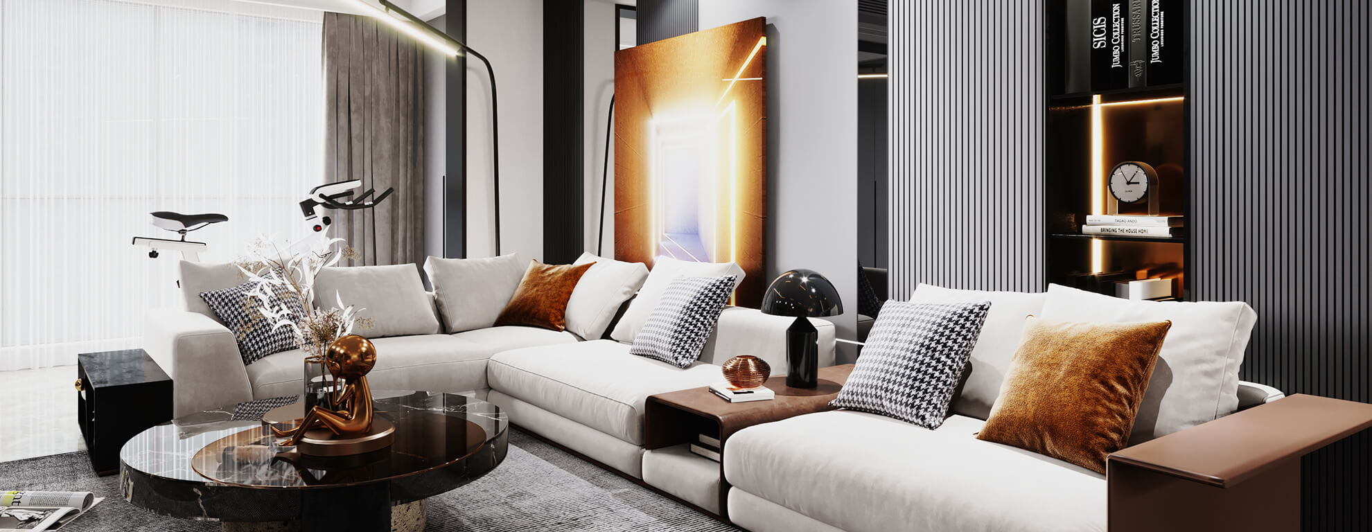 Студия дизайна интерьера AURA разработала проект современной квартиры в Москве. В интерьере сочетаются строгая архитектурная геометрия, сдержанная цветовая палитра и выразительные акценты тёплых оттенков. Пространство гостиной организовано вокруг модульного дивана, декоративного камина и встроенных систем хранения с акцентной подсветкой, что создаёт атмосферу комфорта и визуальной глубины. Продуманное многоуровневое освещение подчёркивает фактуры материалов и формирует сценарии для отдыха и приёма гостей.