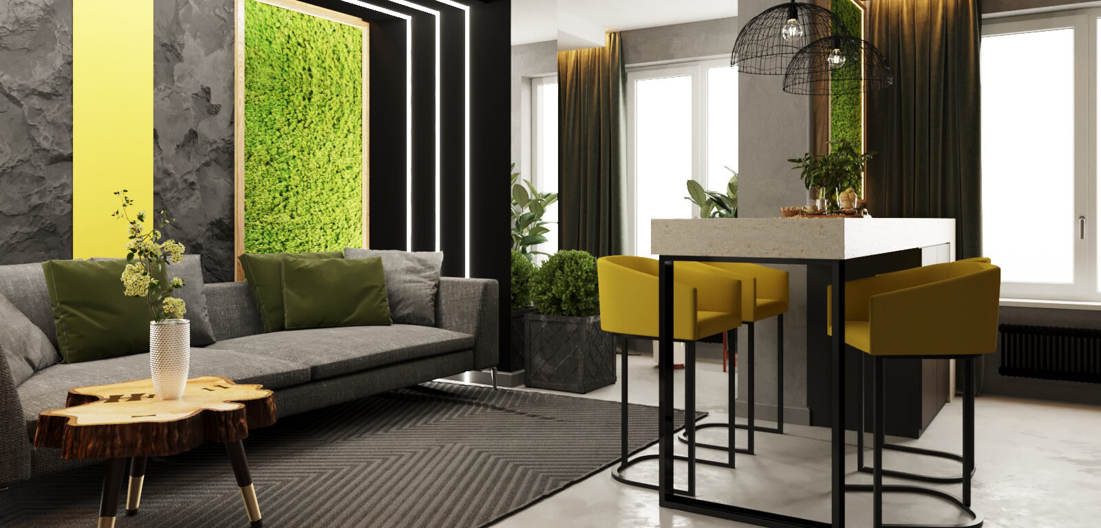 Проект квартиры в Москве выполнен в современной стилистике с акцентом на графичность, природные мотивы и выразительную работу со светом. Интерьер построен на сочетании нейтральной серо-графитовой базы, контрастных черных элементов и ярких акцентных деталей. Зона гостиной дополнена декоративной стеной с натуральной текстурой и вертикальными световыми линиями, которые подчеркивают глубину пространства и формируют динамичную композицию. Встроенные зеленые панели и живые растения добавляют интерьеру свежести и визуального баланса.