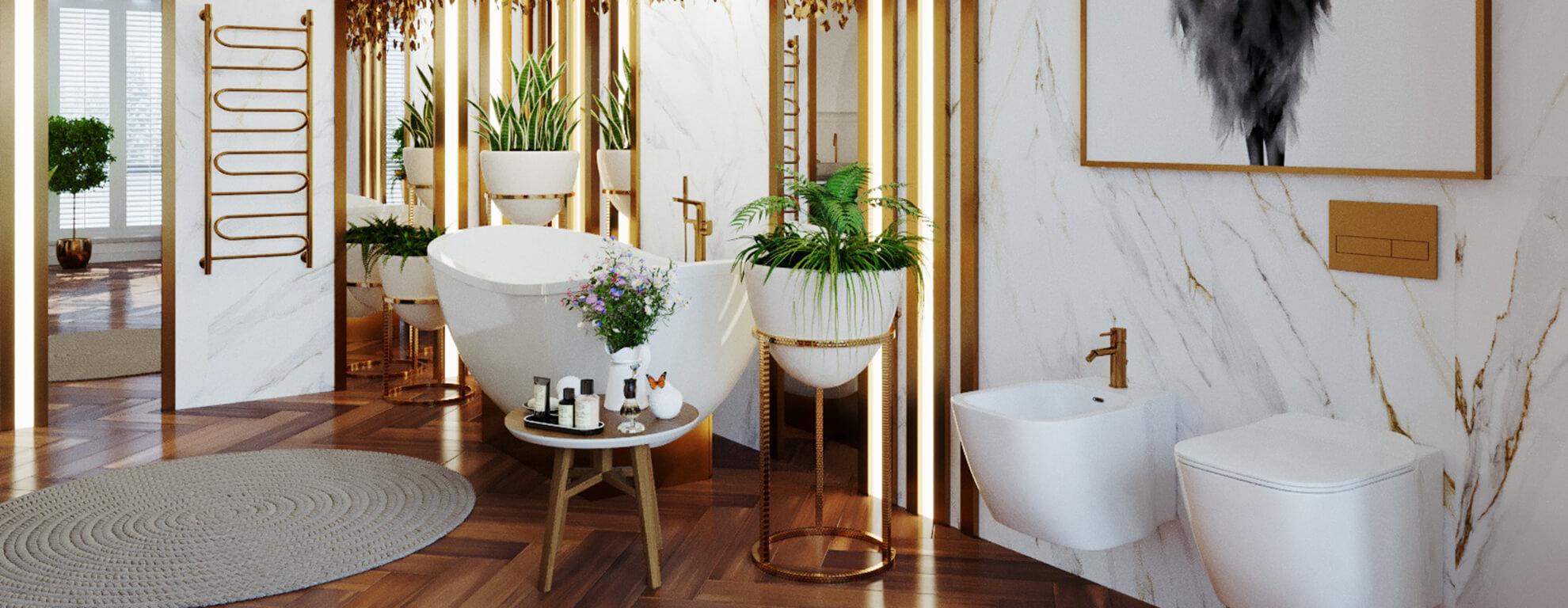 Студия дизайна интерьера AURA разработала дизайн ванной комнаты в загородном доме в Туле. Пространство решено как приватная спа-зона, где сочетаются натуральные материалы, тёплая цветовая гамма и изысканные декоративные элементы. Центральным акцентом стала отдельно стоящая ванна, окружённая архитектурными перегородками с латунными вставками и вертикальной подсветкой. Использование мраморных поверхностей, деревянного пола и живых растений формирует атмосферу уюта, гармонии и расслабления.